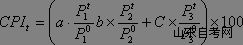 假定面包和汽车是测算物价指数时选取的两种商品,选取某一年为基年如1980年,在这一年,面包的价格为P10,汽车的价格为P20,其他商品的价格为P30,现测算第A年比如1995年的消费物价指数,假设第t年面包的价格为P1t,消费者用于面包的支出与总支出中所占的比重为a,汽车的价格为P2t,在消费支出中所占的比重为b,其他商品的价格为P3t,在消费支出中所占的比重为C,于是以1980年为基年,1995年的消费物价指数为: