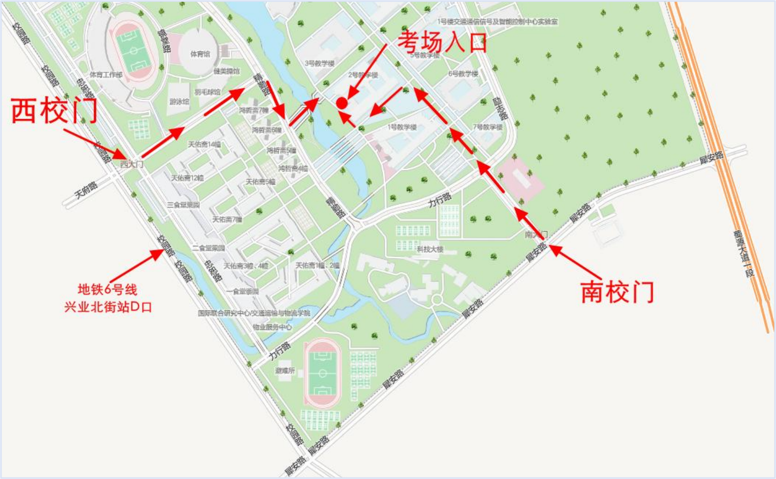 西校门和南校门到考场入口步行路程均约900米。具体路线见下图: